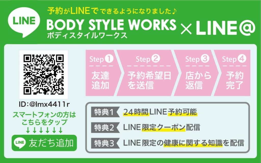広尾・恵比寿・代官山・表参道近辺で「本気で自分のカラダと向き合いたい」「腰痛やしびれと卒業したい」「本物志向のパーソナルジムを探している」方は、ぜひBODY STYLE WORKSまでお気軽にお問い合わせください。